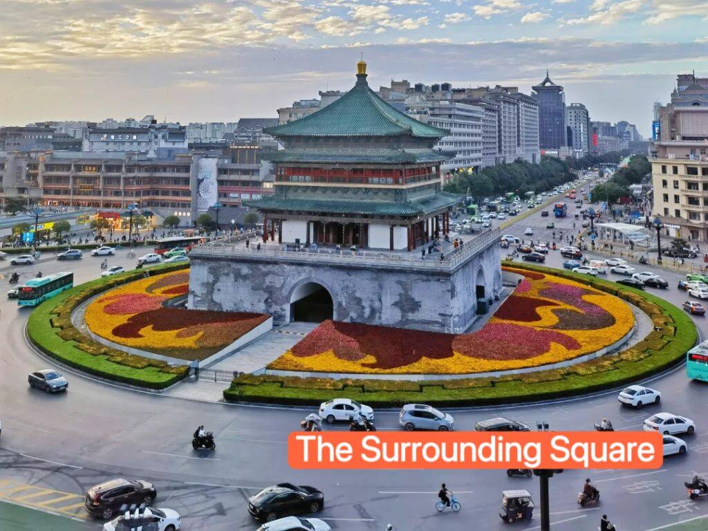 The square around the Bell Tower was built in the 1990s to protect the tower and create a visitor-friendly area. Before that, the area was a busy road, and the Bell Tower was surrounded by traffic. Now, the square has green plants, stone paths, and statues of ancient Chinese figures (related to Xi’an’s history).