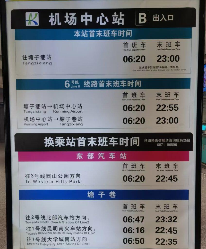 | Line 1 | Kunming Railway Station | 06:30–23:00 (15 mins/shift) | $3.08 | Guandu Square, Jinbi Square | T1 Exit 3; T2 Exit 4 |