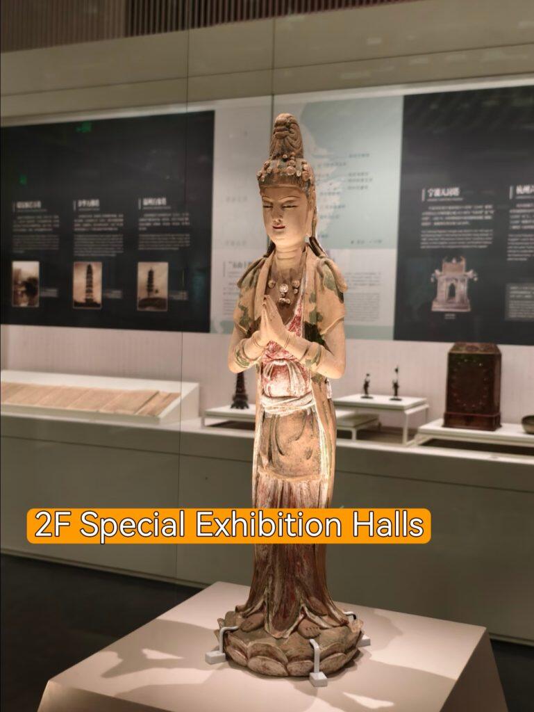 - Buddhist Art Hall: Features the Five Dynasties Gilt Silver Ashoka Pagoda (Leifeng Pagoda underground palace relic) and Northern Song painted clay Guanyin statue