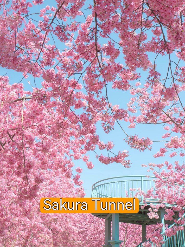 A 100m pink cherry blossom archway (Feb–Mar). Low-angle shots make you feel like walking in a fairy tale—top photo spot.