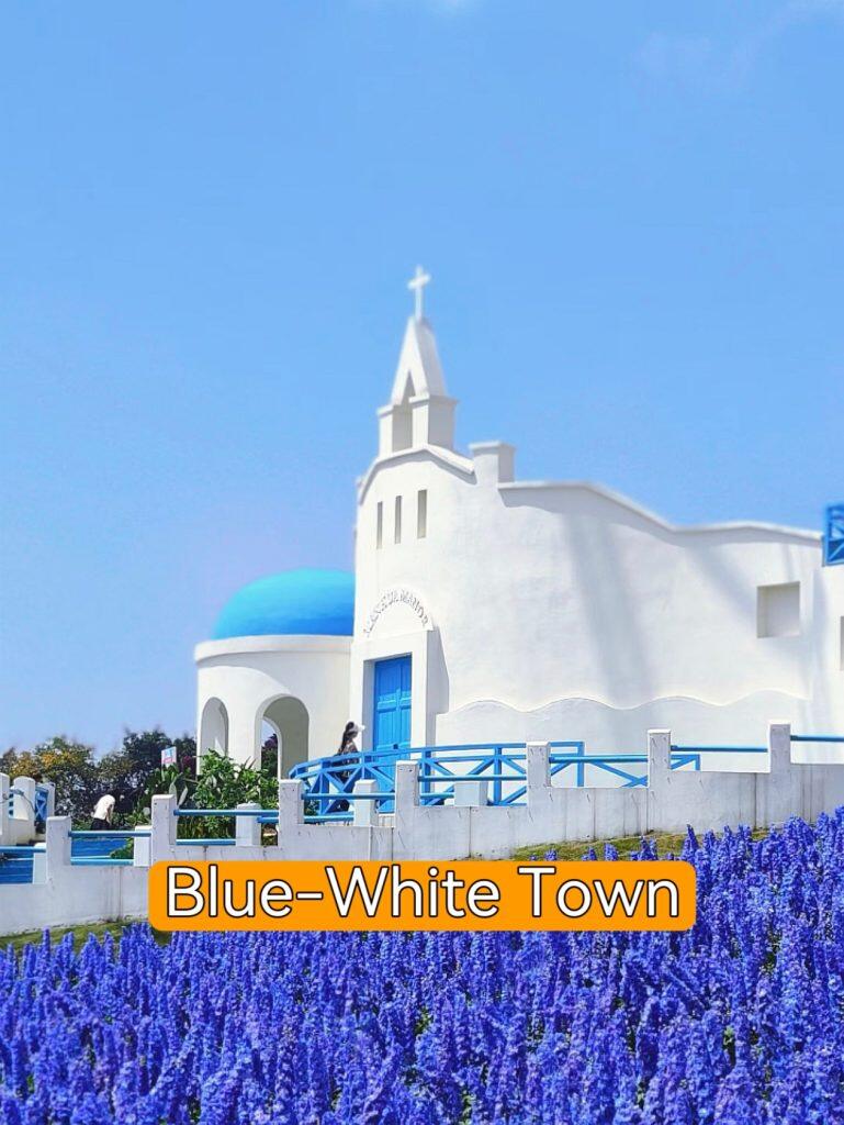 Greek-style blue-and-white buildings with flower backdrops. No passport needed for European-style photos; sunset is magical.