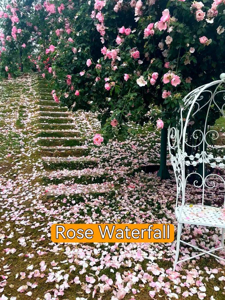 15m hanging rose waterfall (Apr–May) and a 1km rose wall—romantic and perfect for couple shots.
